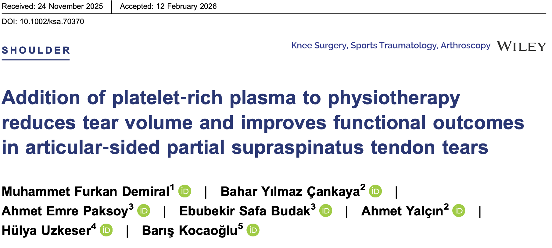Demiral MF, Çankaya BY, Paksoy AE, et al. Addition of platelet-rich plasma to physiotherapy reduces tear volume and іmproves functional outcomes in articular-sided partial supraspinatus tendon tears. Knee Surg Sports Traumatol Arthrosc. Published online February 27, 2026. doi:10.1002/ksa.70370