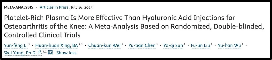 Li YF, Xing HH, Wei CK, et al. Platelet-Rich Plasma Is More Effective Than Hyaluronic Acid Injections for Osteoarthritis of the Knee: A Meta-Analysis Based on Randomized, Double-blinded, Controlled Clinical Trials. Arthroscopy. Published online July 16, 2025. doi:10.1016/j.arthro.2025.06.033