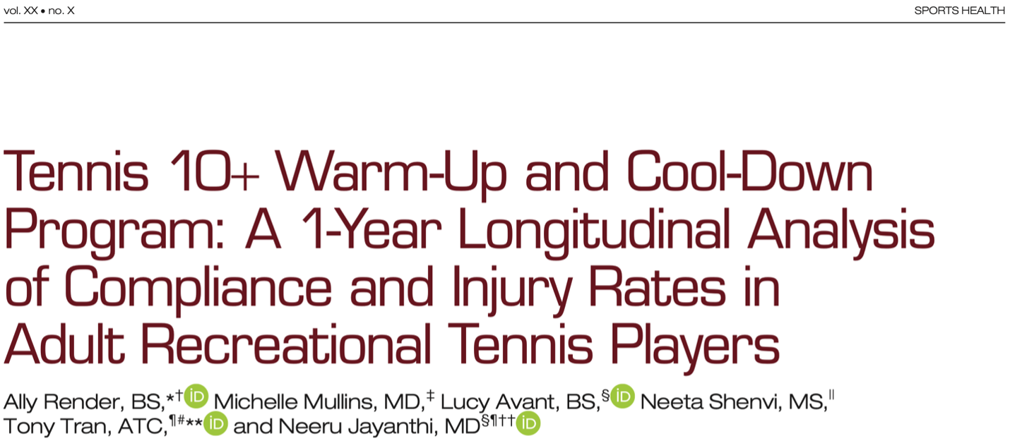 Render A, Mullins M, Avant L, Shenvi N, Tran T, Jayanthi N. Tennis 10+ Warm-Up and Cool-Down Program: A 1-Year Longitudinal Analysis of Compliance and Injury Rates in Adult Recreational Tennis Players. Sports Health. 2026;18(1):47-56. doi:10.1177/19417381251387672